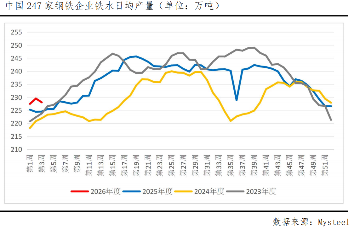 作为铁矿石需求的直接源头,国内钢厂的运营节奏是判断矿价的基石。近期数据显示,钢铁生产的动能正在减弱。一方面,样本钢厂的日均铁水产量与进口矿日耗环比已出现微降,表明铁矿石的真实消耗速度在放缓。另一方面,更为关键的是,钢厂利润改善有限,甚至在当前价位下,生产成本压力再度凸显。盈利空间的收窄,叠加传统淡季背景下钢材社会库存开始累积,导致钢厂进一步扩大生产的意愿不强,对铁矿石的采购态度也转为按需补库,缺乏追涨动力。